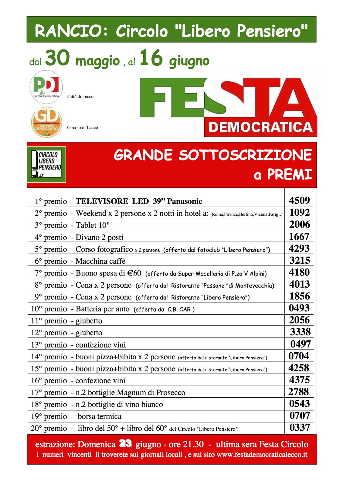 Questi i biglietti vincenti della lotteria della Festa Democratica di Lecco 2013.